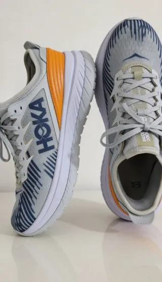 Zapatillas deportivas Hoka con un diseño moderno y llamativo. - Combinación de colores gris y naranja. - Solo se han usado en interior (sala de máquinas de musculación). - Logo de Hoka en contraste. - La primera foto es un render digital. Las demás, del producto real.