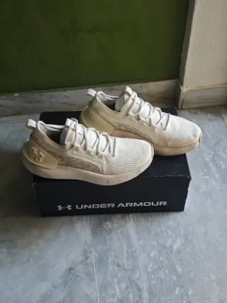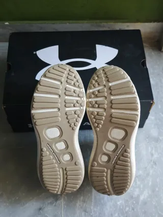 Zapatillas deportivas Under Armour UA HOVR Phantom 3 SE en tonos beige y blanco. Diseño moderno y cómodo. - Parte superior de tejido transpirable. - Sistema de amortiguación UA HOVR. - Suela de goma para mayor tracción. Buen estado, prácticamente sin usar. Under armour, zapatillas, moda, running.
