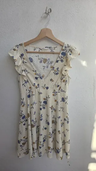 Vestido de Springfield con un bonito estampado floral. - Diseño con escote en V. - Mangas cortas con volantes. - Tejido ligero con pequeños detalles calados.