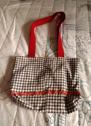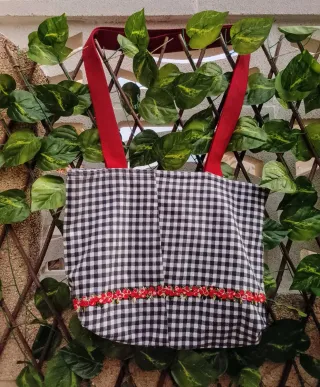 Bolso de tela con estampado Vichy, hecho a mano y decorado con un detalle floral. La parte exterior es upcycling, de unos tejanos, en excelente estado, todo el resto es material nuevo. - Diseño a cuadros en blanco y negro. - Tiras rojas. - Adorno de flores rojas en la parte inferior. - Interior forrado. - 2 bolsillos interiores con cierre velcro. - 1 cinta con mosquetón para llaves. - Se cierra con dos cierres imantados. - Diseño exclusivo. #bolso #bolsomujer #bolsoupcycling #bolsoartesano #bolsomediano #bolsovichy #bolsonuevo #regalo