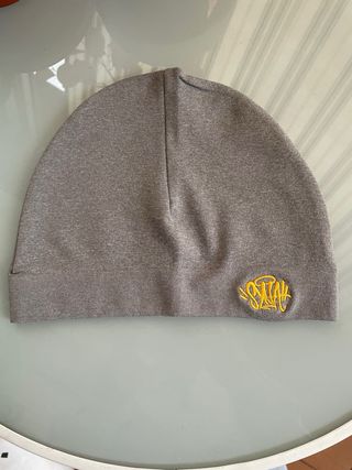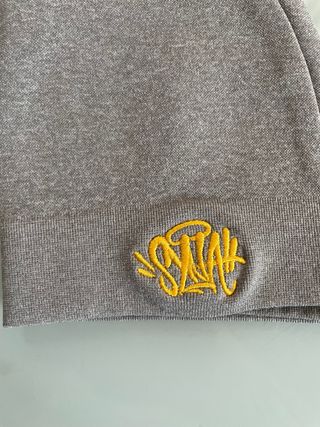 Gorro de la marca Syna World en color gris. Presenta un diseño bordado en color amarillo. - Bordado distintivo en la parte frontal.