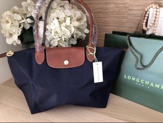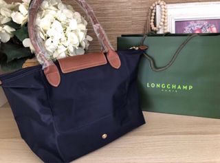 Bolso de mano de la marca Longchamp. - Color azul marino con detalles en marrón. - Asa de cuero. - Cierre de botón a presión y cremallera.