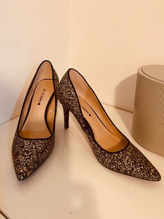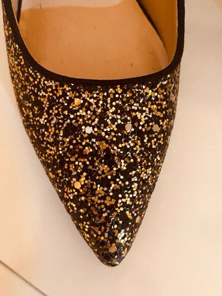 Elegantes zapatos de tacón con un diseño brillante, perfectos para ocasiones especiales. - Acabado con purpurina dorada sobre base negra. - Punta fina y tacón de aguja. - Ribete negro en el borde.