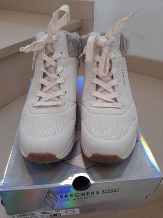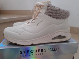 Botines Skechers Darling Daze en color beige, talla 40. Un calzado cómodo y con estilo. - Diseño tipo botín con detalles de punto. - Cierre con cordones. - Suela con tecnología visible.