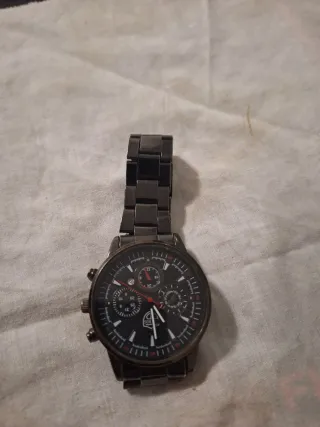 Elegante reloj con diseño moderno. Le falta la pila - Correa de metal. - Esfera negra con detalles plateados y rojos. - Tres subesferas decorativas.