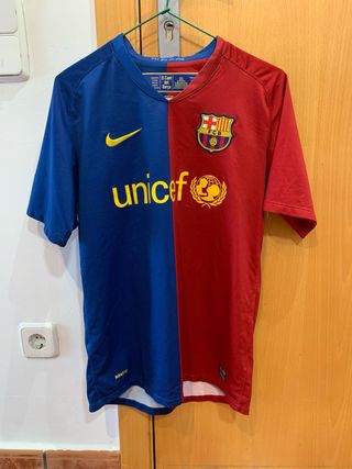 Camiseta oficial del FC Barcelona, con el número 10 de Messi. - Diseño dividido en dos colores: azul y rojo. - Logo de Nike en amarillo. - Escudo del FC Barcelona. - Inscripción 'UNICEF' en la parte frontal.