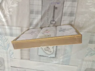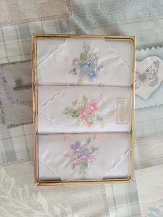 Elegante set de tres pañuelos de tela blanca, cada uno con un delicado bordado floral a mano. - Tres diseños florales distintos. - Bordados en tonos pastel: azul, rosa y lila. - Pañuelos con borde festoneado.