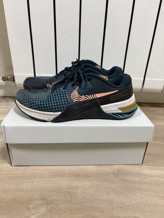 Zapatillas deportivas Nike Metcon en color verde azulado con detalles en rosa y dorado. Diseñadas para el entrenamiento. - Parte superior de malla transpirable. - Suela de goma para mayor tracción. - Cierre de cordones.