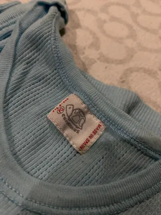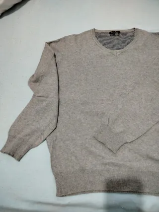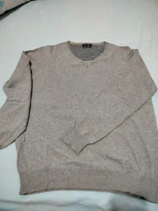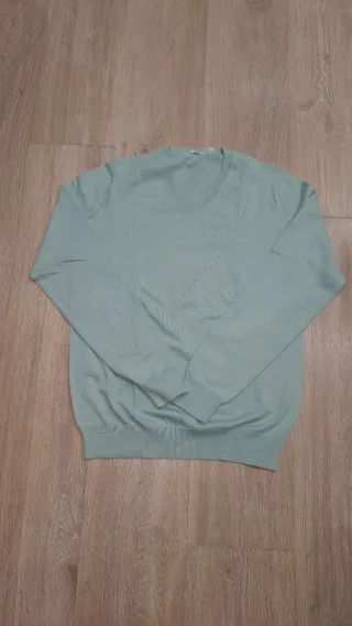 Vendo jersey de punto para hombre con cuello en pico. Tejido suave y ligero. Manga larga. Acabado en canalé en puños y bajo. De color azul claro. Talla L de hombre. En perfecto estado. Las medidas de la prenda son: - De sisa a sisa: 63,5cm - Largo de la prenda: 69cm