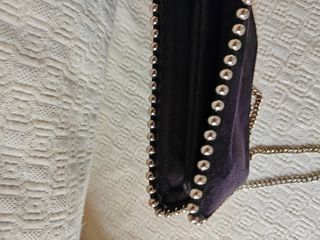 Vendo cartera de color negro bandolera de serraje con tachuelas plateadas. Este bolso de Zara es convertible en cartera y presenta un diseño versátil. Cuenta con un interior dividido en varios compartimentos para mejor organización. La asa de cadena es extraíble, lo que permite llevarlo como bandolera o cartera de mano. La metalería es de color plateado y el cierre es mediante cremallera. El bolso es de color negro y las asas presentan cierto desgaste por el uso. Las medidas están indicadas en las imágenes.