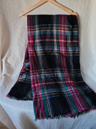 Bufanda o pañuelo grande estilo manta XL. De color negro con estampado de cuadros de diferentes colores como amarillo, azul, rojo o verde. Sus medidas son 138cm x 138cm. En perfecto estado.