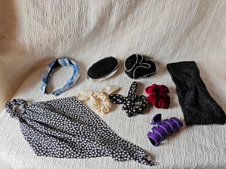 Vendo pack para el cabello que consta de 9 artículos. Los cuales son: - Goma de pelo con lazo estampado de margaritas - Coletero de color negro con estampado de lunares en blanco y un lazo - Coletero de color blanco con un lazo - Coletero granate - Diadema nubes estampado blanco y azul tie dye - Diadema, cinta o banda negra con brillos dorados elástica - Peine o cepillo para el pelo, especial antitirones y desenredantes. Tiene forma de gota, sin mango. Es de color plateado espejo y negro. - pinza grande morada - Coletero negro y morado scrunchie Totalmente nuevos. El pack por 3.5€