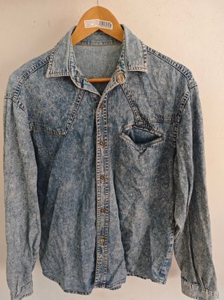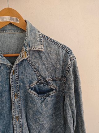 Vendo camisa vaquera de manga larga para hombre. Presenta un diseño clásico con cuello y cierre de botones.Bolsillo en el pecho. Estampado jaspeado característico del tejido vaquero. Puños abotonados. Talla L de hombre. En perfecto estado. Las medidas son: - De sisa a sisa: 57,5cm - Largo de la prenda: 69cm