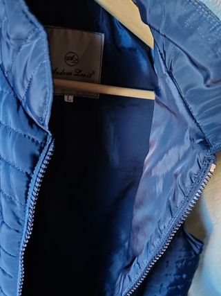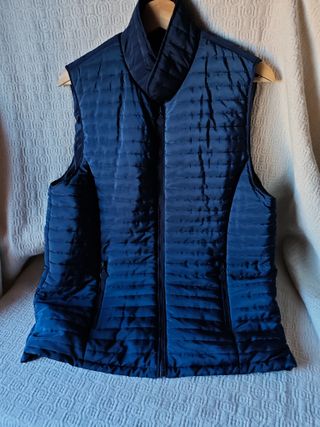 Vendo abrigo o chaqueta que se trata de un chaleco sin mangas acolchada. Es de color azul oscuro. Talla L de mujer. Posee dos bolsillos delanteros y una cremallera para abrir y cerrar el abrigo. En perfecto estado, totalmente nuevo. Las medidas son: - De sisa a sisa: 52cm - De largo: 74cm