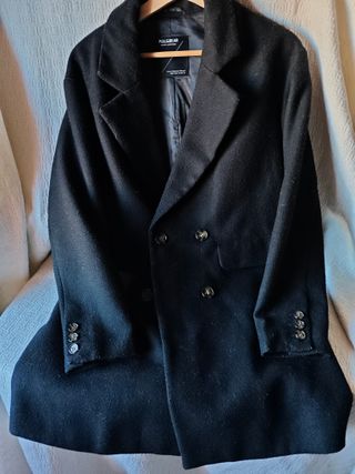 Vendo abrigo largo de paño de color negro, con detalle de botones. Talla M de mujer, de la marca de ropa Pull&Bear, aunque en la etiqueta marca S pero da más talla. Tiene pelusas y pelotillas del uso, se ha usado en bastantes ocasiones. Las medidas son: - De a sisa: 50cm - Largo de la prenda: 87,5cm