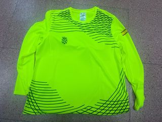 Camiseta deportiva de manga larga con un diseño moderno y llamativo. - Diseño de rayas negras sobre fondo amarillo. - Logo en la parte frontal izquierda.