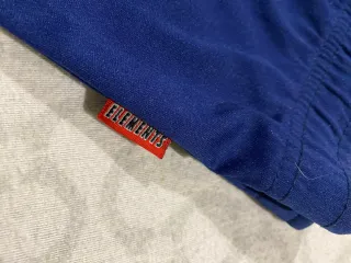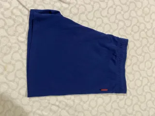 Pantalón de tela azul con un pequeño detalle de marca en la parte inferior. - Cintura elástica. - Tejido suave al tacto.
