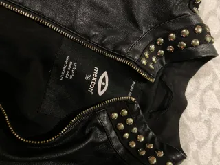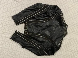 Conjunto de ropa con un diseño llamativo y moderno. - Color negro. - Adornado con tachuelas plateadas. - Mangas largas. - Diseño con cortes y líneas.