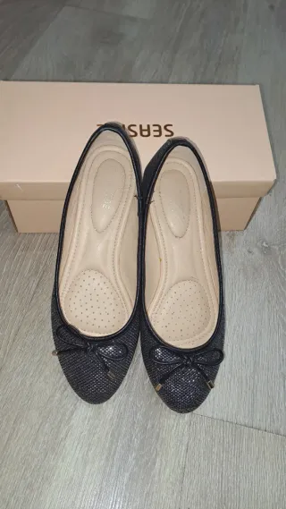 Manoletinas negras con un toque brillante y un lazo decorativo. - Diseño plateado - Detalle de lazo en la punta. - Suela cómoda. Puestos en una ocasión. Se puede ver sin compromiso