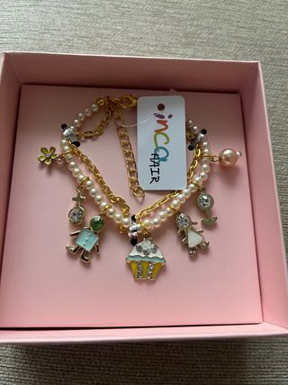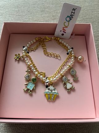 Bonita pulsera de bisutería con varios charms. - Diseño con perlas y cadena dorada. - Incluye charms de figuritas, cupcake y flor. - Cierre de mosquetón.