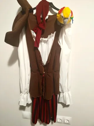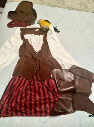 Completo disfraz de pirata para mujer, con una sola puesta!talla M-L, con muchos accesorios y hasta un loro que habla! - Incluye vestido,cinta de pelo,gorro,cubrebotas,cinturón,loro