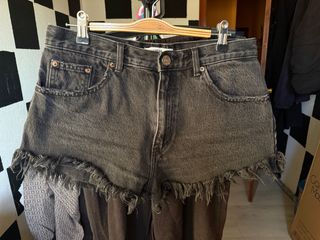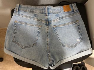 Pantalones cortos vaqueros de estilo desgastado y con rotos. - Diseño moderno con rotos. - Cintura alta. - Acabado deshilachado en el bajo. También los puedo vender por separado.