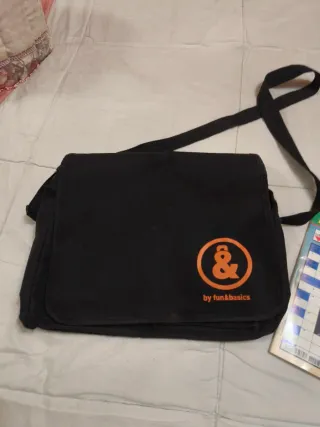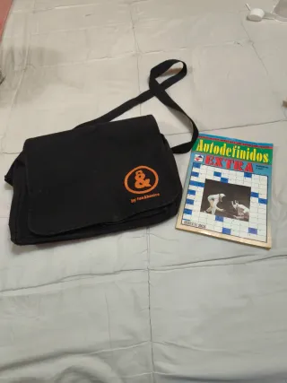 Bolso negro de la marca fun&basics junto con un libro de Autodefinidos Extra. - Bolso con logo naranja. - Libro de pasatiempos.