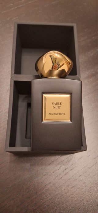 Este es el perfume Sable Nuit de Armani. - Botella con tapa dorada. - Etiqueta dorada con el nombre del perfume y la marca.