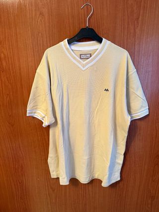 Camiseta de manga corta con cuello en V y detalles de rayas en el cuello y mangas. - Logo bordado en el pecho. - Cuello y mangas con ribete a rayas.