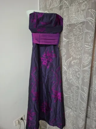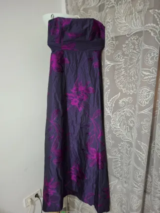 Elegante vestido de fiesta largo. - Diseño sin tirantes. - Cinturón ancho con pliegues. - Estampado floral en tono fucsia.