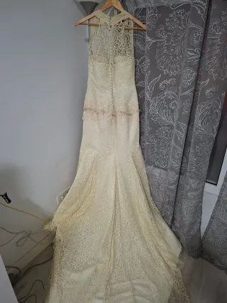 Elegante vestido de novia con un delicado diseño de encaje. Can can y vuelo , costo 1000e - Corte sirena. - Escote halter. - Detalle de pedrería en la cintura. - Espalda con botones.