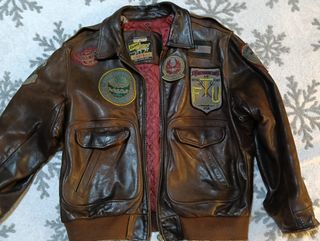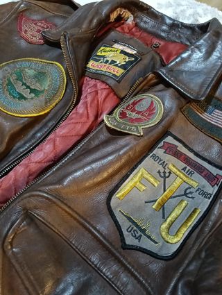 Chaqueta estilo militar KUDSAK original en cuero auténtico color marrón. Una pieza con mucha personalidad y estética retro. Vintage. Parches bordados de aviación y forro interior acolchado en color granate. Con bolsillo interior. (Algunos desgaste en el interior)
