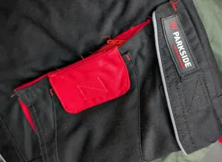 Pantalones de trabajo Parkside con un diseño funcional y detalles llamativos. - Cierre de botón y cremallera. - Bolsillos con solapa y botón. - Ribete rojo en los bolsillos y laterales. - Costuras reforzadas.