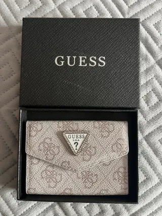 Monedero de la marca Guess con un diseño elegante. - Estampado con el logo de la marca. - Detalle de triángulo con el logo y pedrería. - Cierre de solapa.
