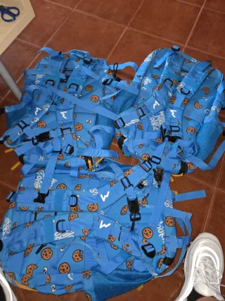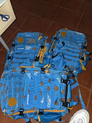 Conjunto de tres mochilas ELITEX con un divertido estampado de galletas. Son perfectas para llevar todo lo necesario. - Diseño llamativo en azul y multicolor. - Capacidad de 50 litros cada una. -hay una con una pequeña tara , a esa se le descontarian 5 euros - precio por unidad - solamente quedan dos