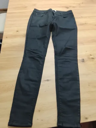 Pantalones negros de corte ajustado. - Diseño liso. - Cintura con trabillas para cinturón. - Cierre de cremallera y botón.
