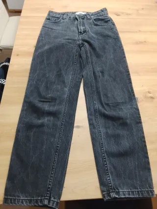 Vaqueros de corte recto con un acabado desgastado. - Cintura alta. - Cierre de cremallera y botón. - Bolsillos delanteros y traseros. - Costuras reforzadas.