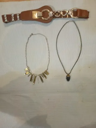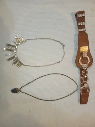 Conjunto de accesorios que incluye un collar y un cinturón. - Collar con diseño de barras metálicas y detalles brillantes. - Cinturón de cuero con hebilla y adornos de pedrería.