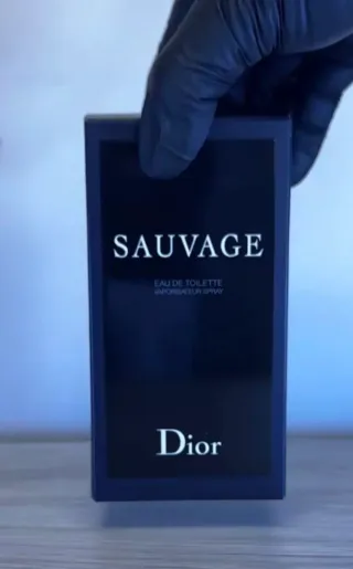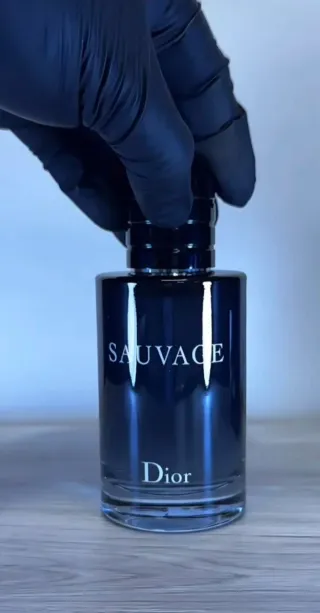 Este es el perfume Sauvage de Dior en un elegante frasco azul. - Fragancia icónica. - Diseño clásico de la botella.