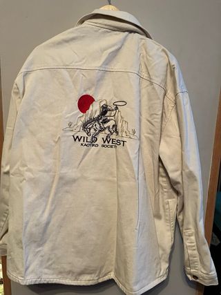 Chaqueta vaquera de la marca Kaotiko en color beige. Tiene un pequeño bordado en uno de los bolsillos. - Cierre de botones. - Dos bolsillos en la parte delantera. - Cuello camisero. - Mangas largas.