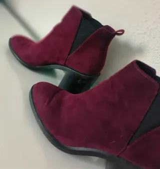 Botines de ante en color borgoña con tacón. - Material: Ante - Color: Borgoña - Diseño: Botín - Tacón: Bloque Estan muy bien pero tienen un defecto que casi no se ve en el tacón y en la puntera.