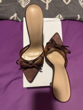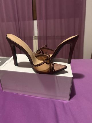 Elegantes tacones marrones con un delicado lazo. - Diseño de punta fina. - Tira transparente. - Tacón alto.