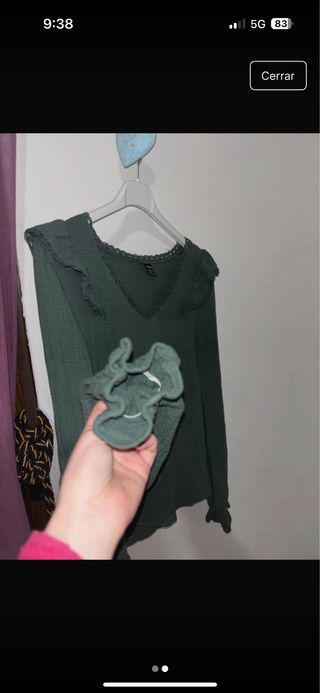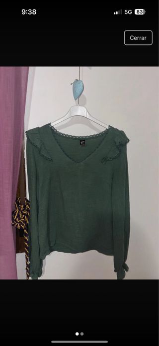 Camisa de manga larga en un bonito tono verde botella. Presenta detalles de volantes en los hombros y un delicado borde festoneado en el escote. - Manga larga. - Escote en V con borde festoneado. - Volantes decorativos en los hombros. - Puños con detalle de volante.