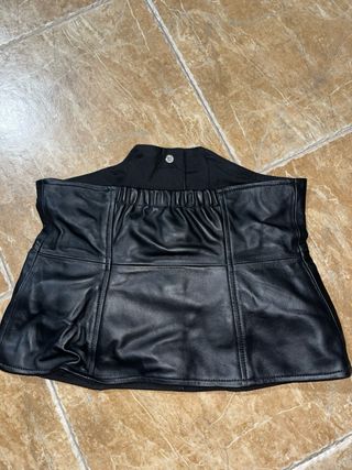 Corpiño con un diseño moderno y atrevido, confeccionado en un material que imita la piel. - Diseño tipo corsé. - Cierre de botones frontales. - Dos bolsillos de fuelle en la parte delantera. - Costuras detalladas.