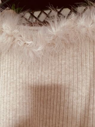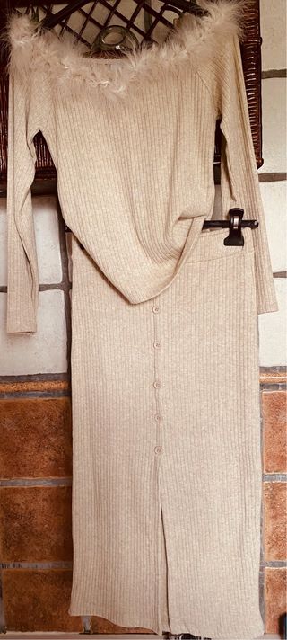 Conjunto de falda y top de canales muy fino y suave Escote amplio con plumas en la parte delantera Botones falsos, cintura ancha y elástica Abertura hasta la rodilla