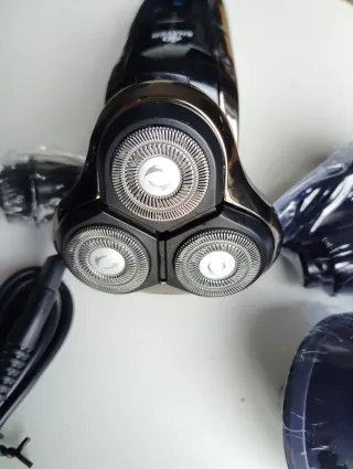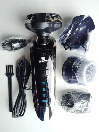 Afeitadora eléctrica rotativa recargable con diseño moderno. - Cabezal flotante 4D. - Indicadores LED de carga y bloqueo. - Incluye accesorios de limpieza y carga.