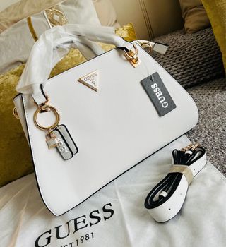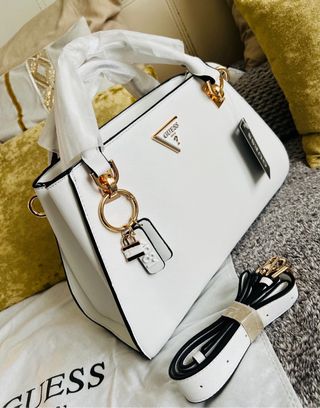 Elegante bolso tote de la marca Guess, en un llamativo color blanco con detalles dorados. - Diseño estructurado. - Incluye asa corta y correa larga ajustable. - Adornado con un charm de candado y etiquetas. - Logo metálico de Guess en la parte frontal. Varios compartimentos Incluye bolsa para guardar del polvo Sin estrenar Súper elegante