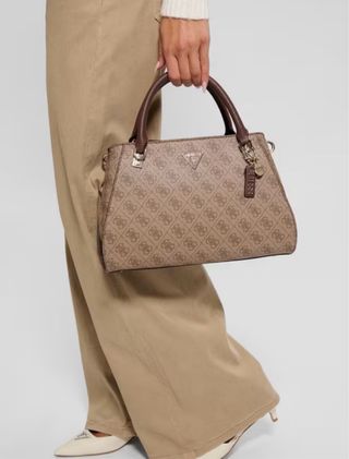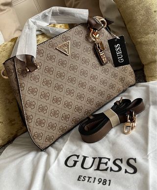 Bolso tote Guess con un diseño elegante y práctico. - Estampado monograma en tonos beige y marrón. - Detalle de logo metálico en forma de triángulo. - Incluye asa corta y correa larga ajustable. - Llavero decorativo con el logo de la marca. Varios compartimentos Precioso color combinación de marrones . Incluye bolsa guarda polvo Sin estrenar