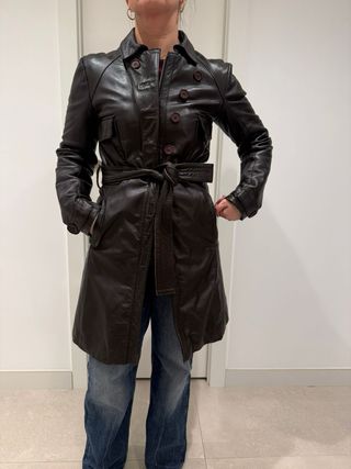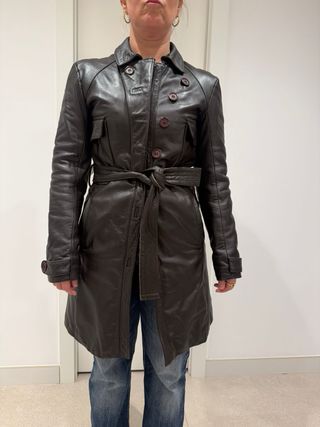 Elegante trench de piel 100% en un bonito tono marrón chocolate. Un clásico atemporal con un diseño moderno. - Confeccionado en piel genuina. - Cierre de doble cremallera. - Cinturón a juego para ajustar la silueta.