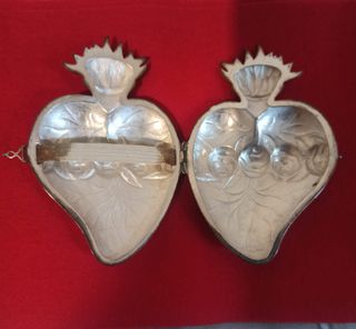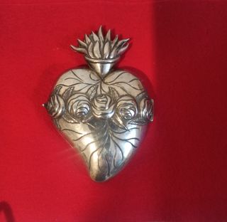 Precioso exvoto antiguo con forma de corazón sagrado, elaborado en plata. Cinco heridas de jesus - Diseño detallado con rosas y llamas. - Pieza de colección con un acabado plateado. - Ideal para coleccionistas de arte sacro o piezas vintage.